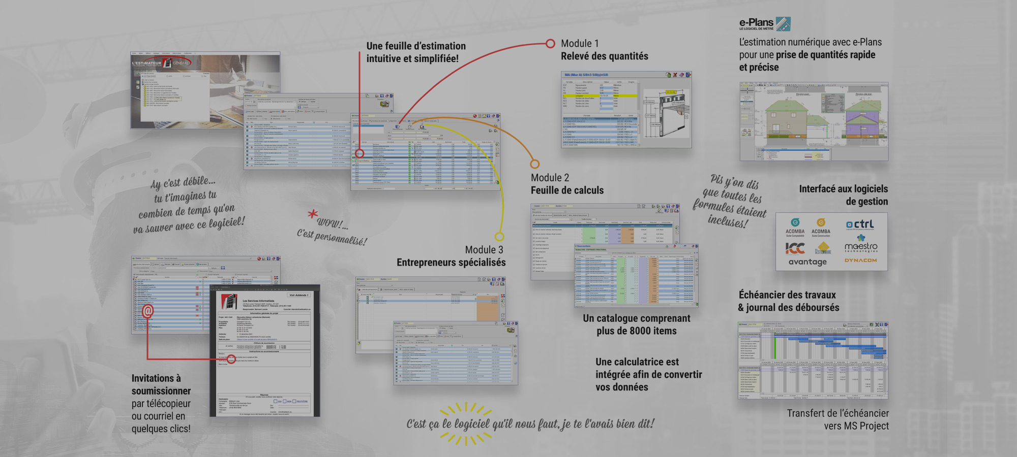 Our estimation software offers its users a simple and structured method of protection as well as the ability to automatically calculate without error all the materials in the file being processed. The estimator can systematically proceed to the evolution of the files and carry out all the analyzes necessary for his work.